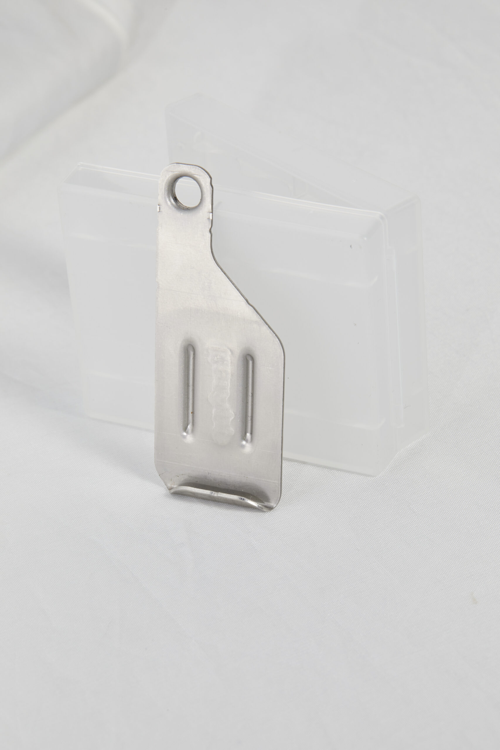 Le crochet est appliqué à l’arrière du bardage au moyen d’une rainure spéciale, qui permet l’insertion précise et stable de la fixation. Une languette pliée s’insère dans une encoche prédéfinie à l’arrière de la dalle, ce qui garantit la tenue du revêtement même en cas de contrainte ou de tassement structurel.